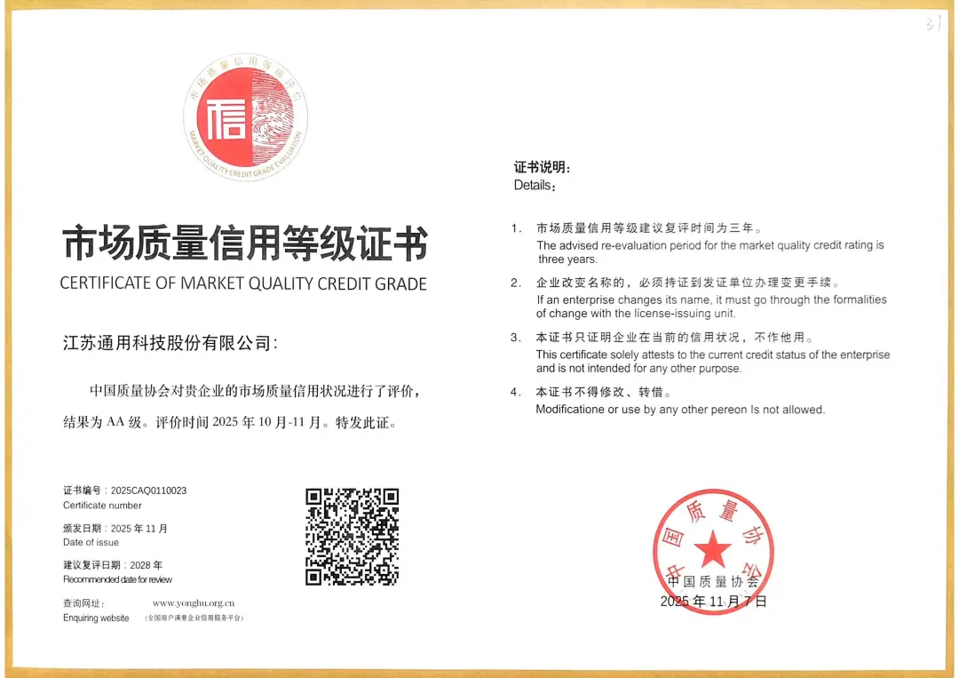 近日,随着中国质量协会“2025年第二批全国市场质量信用A等企业”榜单的正式揭晓,通用股份凭借其在质量管理体系上的深耕细作、诚信经营的坚定践行,以及对卓越品质的持续供给,成功获评“市场质量信用等级AA级企业”称号。