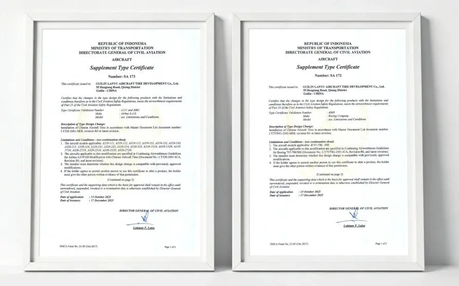 近日,桂林蓝宇航空轮胎发展有限公司研发的波音737NG、空客A320系列航空轮胎,成功获得印度尼西亚航空运输总局(DGCA)颁发的补充型号合格证(STC)。这是国产民航轮胎首次取得国际STC装机批准证书,标志着该产品正式获得进入国际市场的“准入证”,实现了从国内适航到国际认可的关键跨越。