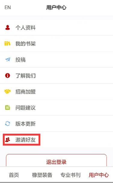 在“用户中心”页面的最下方有一个“邀请好友”项。